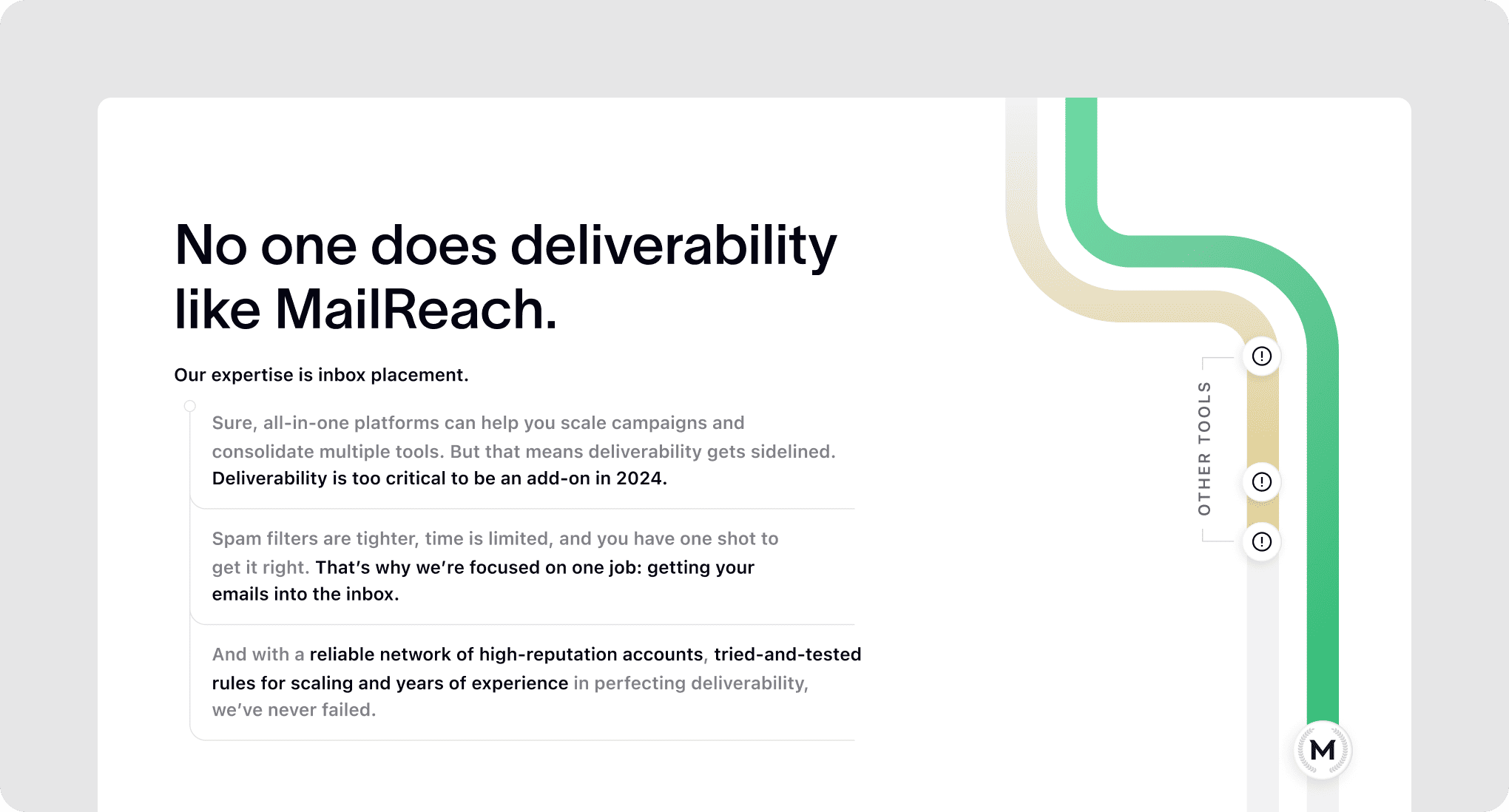The old messaging failed to educate them on why specialized solutions like MailReach were better for deliverability and warming. And why it mattered so much.